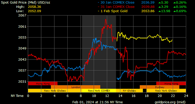 Giá vàng tương lai giao tháng 4/2024 trên sàn Comex New York tăng 3,7 USD, tương ứng tăng 0,18% lên mức 2.071,1 USD/ounce.