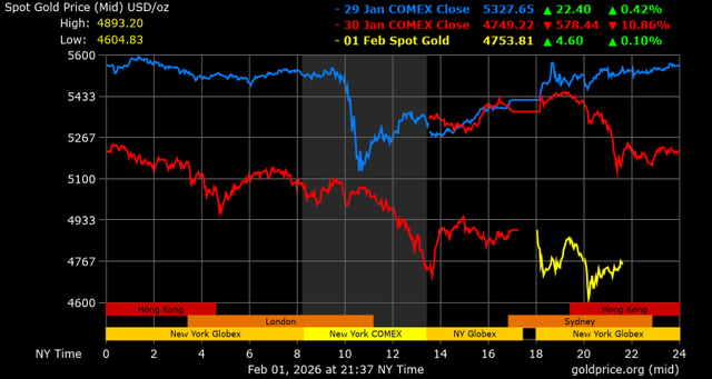 Giá vàng tương lai giao tháng 4/2026 trên sàn Comex New York cuối tuần qua giảm tới 609,7 USD, tương ứng giảm 11,39% xuống mức 4.745,1 USD/ounce.