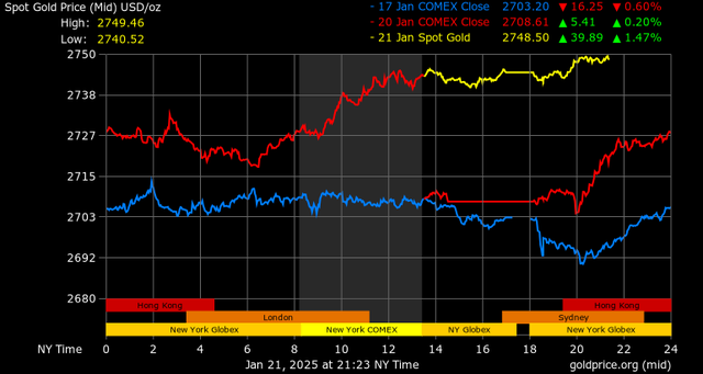 Giá vàng tăng cao hơn, với giá vàng tháng 2 đạt mức cao nhất trong 2,5 tháng, được thúc đẩy bởi sự sụt giảm mạnh của chỉ số đô la Mỹ và lợi suất trái phiếu kho bạc Hoa Kỳ để bắt đầu tuần giao dịch ngắn ngày lễ tại Hoa Kỳ. Thêm vào đó là một số nhu cầu trú ẩn an toàn nhẹ trong bối cảnh bất ổn liên quan đến các chính sách mới của chính quyền Tổng thống Trump.