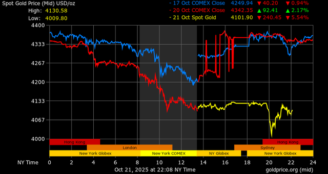 Giá vàng tương lai giao tháng 12/2025 trên sàn Comex New York giảm mạnh 250,3 USD, tương ứng giảm 5,74% xuống mức 4.109,1 USD/ounce.
