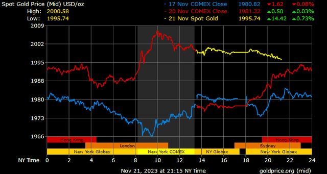 Giá vàng tương lai giao tháng 12/2023 trên sàn Comex New York tăng 21,3 USD, tương ứng tăng 1,08% lên 2.001,6 USD/ounce.