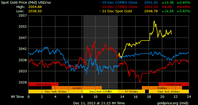 Giá vàng tương lai giao tháng 2/2024 trên sàn Comex New York tăng 3,6 USD, tương ứng tăng 0,18% lên 2.051,3 USD/ounce.