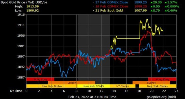 Thị trường kim loại quý vẫn chịu sự bất ổn về địa chính trị. Giá vàng qua đêm đã đẩy lên mức cao nhất trong 8 tháng là 1.910,80 USD/ounce khi các nhà đầu tư đưa tin vào cuối tuần rằng Nga và Belarus thông báo sẽ gia hạn các cuộc tập trận quân sự, dự kiến sẽ kết thúc vào Chủ nhật. Tuy nhiên, giá vàng đã giảm so với mức cao nhất trong phiên sau khi có tin Tổng thống Pháp Emmanuel Macron đề xuất hội đàm thượng đỉnh giữa Nga và Mỹ; tuy nhiên, hai bên đã chính thức đồng ý đàm phán.