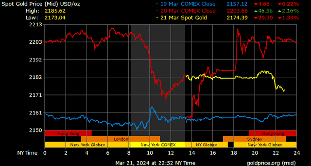 Trên thị trường vàng thế giới, giá vàng giao ngay chốt phiên hôm qua tại Mỹ giảm 5 USD xuống 2.181,4 USD/ounce. Sang phiên châu Á sáng nay, giá vàng tiếp tục giảm 7 USD xuống 2.174,4 USD/ounce.