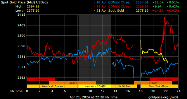 Trên thị trường vàng thế giới, giá vàng giao ngay chốt phiên cuối tuần qua tại Mỹ tăng 13 USD lên 2.392 USD/ounce. Sang phiên châu Á sáng nay, giá vàng đảo chiều giảm 16,5 USD xuống 2.375,6 USD/ounce.