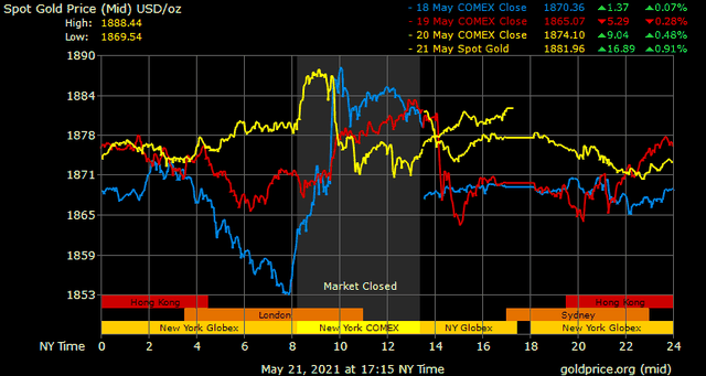 Trên thị trường vàng thế giới, giá vàng giao ngay chốt phiên đêm qua tại Mỹ tăng 4,1 USD lên 1.880,7 USD/ounce. Giá vàng tương lai giao tháng 6 trên sàn Comex New York giảm không đáng kể xuống 1.881,1 USD/ounce.