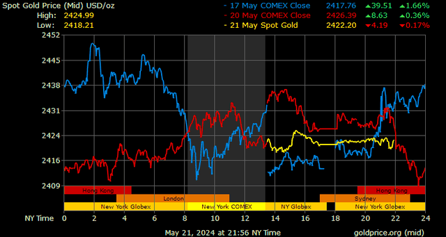 Trên thị trường vàng thế giới, giá vàng giao ngay chốt phiên hôm qua tại Mỹ giảm 5,5 USD xuống 2.421 USD/ounce. Sang phiên châu Á sáng nay, giá vàng đảo chiều tăng nhẹ 1,5 lên 2.422,5 USD/ounce.