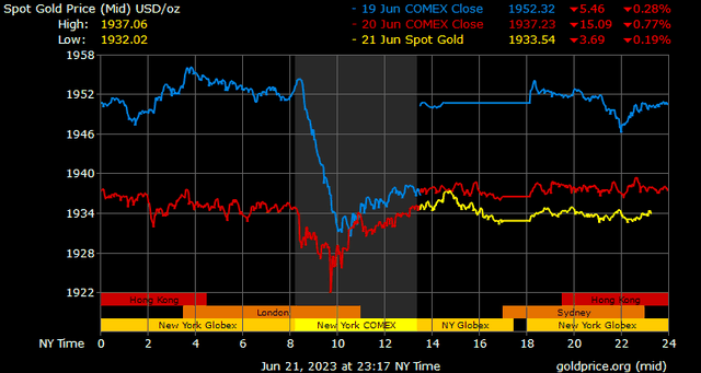 Trên thị trường vàng thế giới, giá vàng giao ngay chốt phiên hôm qua tại Mỹ giảm 3,9 USD xuống 1.932,6 USD/ounce. Sang phiên châu Á sáng nay, giá vàng đi ngang và đang đứng ở mức 1.932,2 USD/ounce.