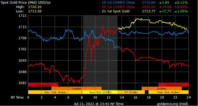 Giá vàng tương lai giao tháng 8/2022 trên sàn Comex New York tăng 13,2 USD xuống 1.713,4 USD/ounce.