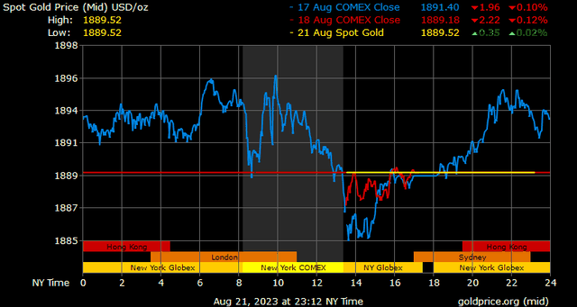 Trên thị trường vàng thế giới, giá vàng giao ngay chốt phiên hôm qua tại Mỹ tăng 5 USD lên 1.894,5 USD/ounce. Sang phiên châu Á sáng nay, giá vàng đi ngang và tạm đứng tại mức 1.894,6 USD/ounce.