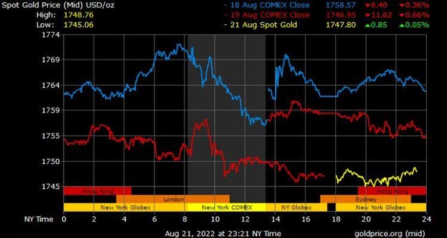 Haberkorn đã cảnh báo về giá thấp hơn vào tuần tới trước hội nghị chuyên đề Jackson Hole, nói thêm rằng đồng đô la Mỹ có thể tăng đáng kể. Ông nói: “Rất khó để vàng có thể tăng điểm trong môi trường này. Hỗ trợ của vàng là khoảng 1.720 USD và sau đó giảm xuống 1.700 USD. Sẽ có nhiều người mua dưới mức đó."