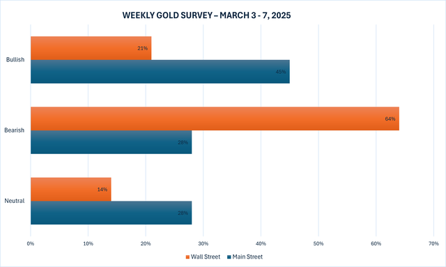 Tuần này, 14 nhà phân tích đã tham gia Khảo sát vàng của Kitco News, với tâm lý lạc quan ngắn hạn của Phố Wall gần như biến mất. Chỉ có ba chuyên gia, hay 21%, dự kiến ​​giá vàng sẽ tăng trong tuần tới, trong khi chín nhà phân tích, hay 64%, dự đoán giá kim loại quý này sẽ giảm. Hai chuyên gia còn lại, chiếm 14% tổng số, dự kiến ​​giá vàng sẽ giao dịch ngang vào tuần tới.