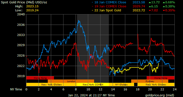 Giá vàng tương lai giao tháng 2/2024 trên sàn Comex New York giảm 7,1 USD, tương ứng giảm 0,35% xuống mức 2.022,2 USD/ounce.