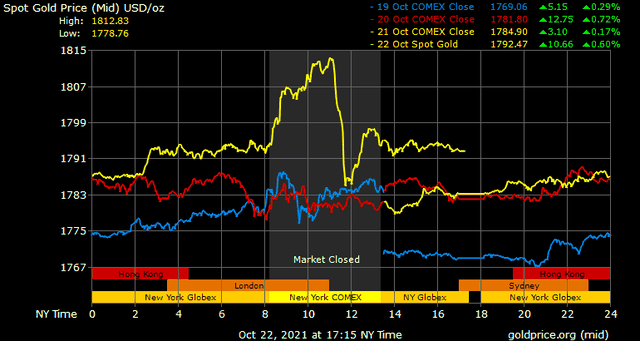 Giá vàng thế giới phiên ngày thứ Sáu giữ đà đi lên và có thời điểm nhảy vọt lên gần 1.815/ounce, nhờ đồng USD và lợi suất trái phiếu Mỹ hạ nhiệt, nhưng cũng đã hạ nhiệt khá nhanh sau đó, bởi nhận định của chủ tịch Fed rằng, lạm phát tại Mỹ có thể sẽ kéo dài sang năm sau, và đã đến lúc thu hẹp quy mô chương trình mua tài sản hàng tháng trị giá 120 tỷ USD của Fed.