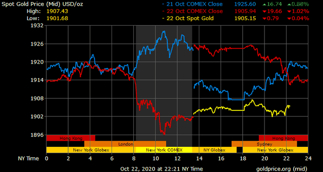 Trên thị trường vàng thế giới, giá vàng giao ngay chốt phiên đêm qua tại Mỹ giảm 19,2 USD xuống 1.905,1 USD/ounce. Sang phiên châu Á sáng nay, giá vàng chững lại và đi ngang quanh ngưỡng trên. Giá vàng tương lai giao tháng 11 trên sàn Comex New York tăng chưa đến 1 USD lên 1.902,3 USD/ounce.