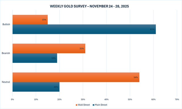 Cuộc khảo sát vàng hàng tuần mới nhất của Kitco News cho thấy phần lớn Phố Wall chuyển sang xu hướng giảm giá hoặc trung lập, trong khi các nhà đầu tư Main Street vẫn duy trì xu hướng tăng giá.