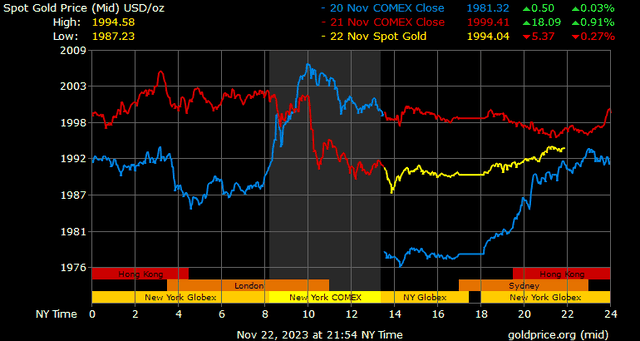 Giá vàng tương lai giao tháng 12/2023 trên sàn Comex New York giảm 8,8 USD, tương ứng giảm 0,44% xuống 1.992,8 USD/ounce.