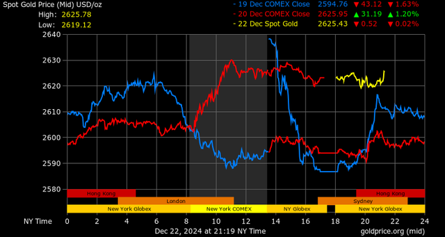 Trên thị trường vàng thế giới, giá vàng giao ngay chốt phiên cuối tuần qua tại Mỹ tăng 29,1 USD lên 2.623,6 USD/ounce. Sang phiên châu Á sáng nay, giá vàng tiếp tục tăng nhẹ 2,5 USD lên 2.626,1 USD/ounce.