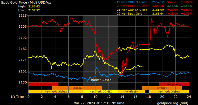 Giá vàng tương lai giao tháng 4/2024 trên sàn Comex New York giảm 24,7 USD xuống 2.160 USD/ounce.