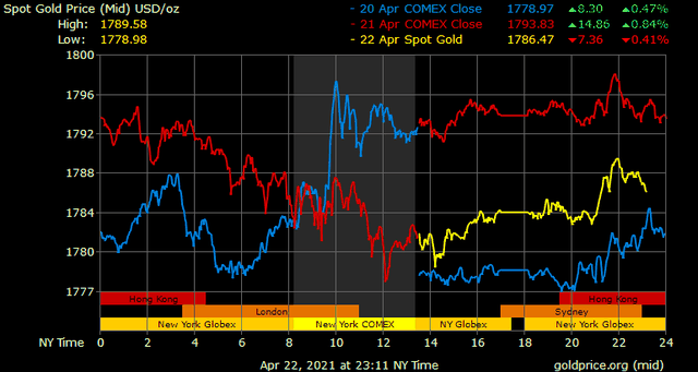 Trên thị trường vàng thế giới, giá vàng giao ngay chốt phiên đêm qua tại Mỹ giảm 9,7 USD xuống 1.783,9 USD/ounce. Sang phiên châu Á sáng nay, giá vàng hồi lên trên 1.786 USD/ounce.