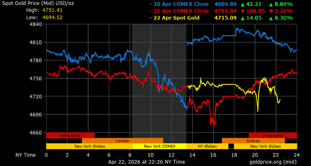 Trên thị trường vàng thế giới, giá vàng giao ngay chốt phiên hôm qua tại Mỹ tăng nhẹ 19,8 USD, tương ứng tăng 0,42% lên mức 4.740,5 USD/ounce. Sang phiên châu Á sáng nay, giá vàng đảo chiều giảm 23,2 USD xuống mức 4.717,3 USD/ounce.