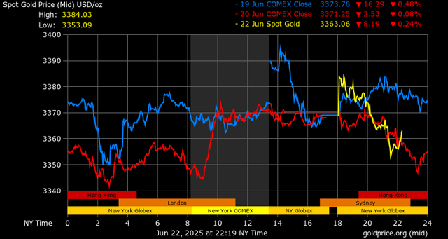 Trên thị trường vàng thế giới, giá vàng giao ngay chốt phiên cuối tuần qua tại Mỹ giảm nhẹ 1,6 USD xuống mức 3.368,8 USD/ounce. Sang phiên châu Á sáng nay, giá vàng tiếp tục giảm 5 USD xuống 3.363,8 USD/ounce.
