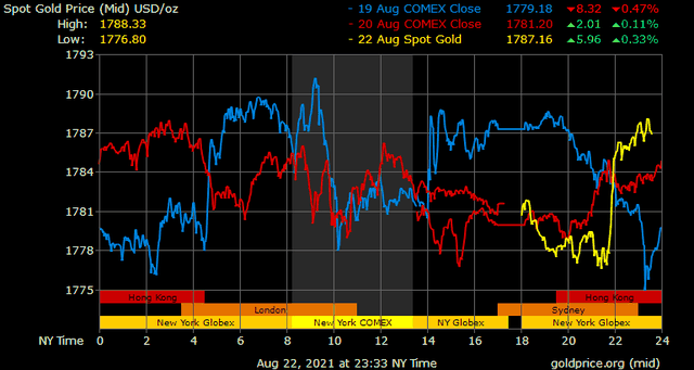 Trên thị trường vàng thế giới, giá vàng giao ngay chốt phiên cuối tuần qua tại Mỹ tăng 0,3 USD lên 1.780,7 USD/ounce. Sang phiên châu Á sáng nay, giá vàng thế giới vọt lên gần 1.787 USD/ounce.