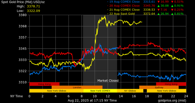 Phần lớn mức tăng của vàng diễn ra vào thứ Sáu, sau bài phát biểu rất được mong đợi của Powell tại hội nghị chuyên đề thường niên của ngân hàng trung ương Cục Dự trữ Liên bang Mỹ. Powell nhấn mạnh những rủi ro kinh tế ngày càng tăng do lạm phát gia tăng và hoạt động kinh tế chậm lại, nhưng lưu ý rằng vẫn còn dư địa để cắt giảm lãi suất.