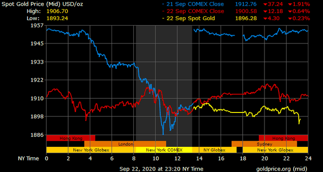 Trên thị trường vàng thế giới, giá vàng giao ngay chốt phiên đêm qua tại Mỹ giảm 12,3 USD xuống 1.900,1 USD/ounce. Sang phiên châu Á sáng nay, giá vàng tiếp tục giảm và lùi về gần 1.895 USD/ounce. Giá vàng tương lai giao tháng 10 trên sàn Comex New York giảm 11 USD xuống 1.888,3 USD/ounce.