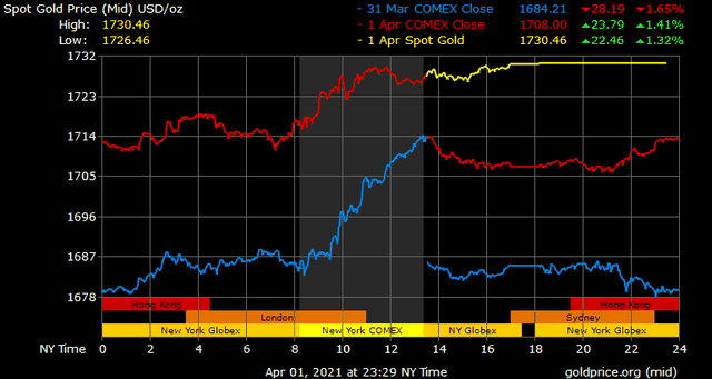 Trên thị trường vàng thế giới, giá vàng giao ngay chốt phiên đêm qua tại Mỹ tăng 21,5 USD lên 1.730,3 USD/ounce. Giá vàng tương lai giao tháng 5 trên sàn Comex New York tăng 15,9 USD lên 1.730 USD/ounce.