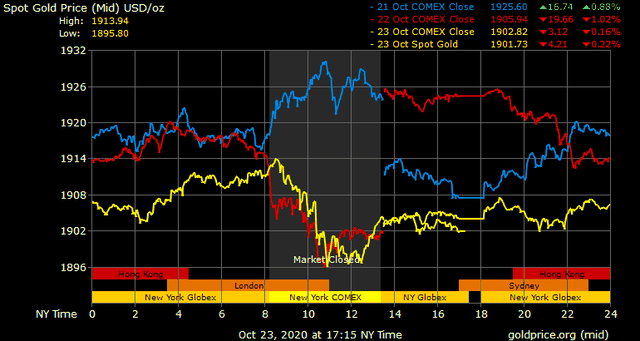 Trên thị trường vàng thế giới, giá vàng giao ngay chốt phiên đêm qua tại Mỹ giảm 3,8 USD xuống 1.901,3 USD/ounce. Giá vàng tương lai giao tháng 11 trên sàn Comex New York giảm hơn 1 USD xuống 1.900,5 USD/ounce.