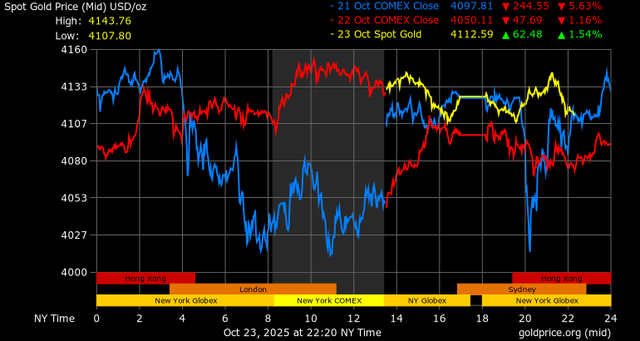 Giá vàng tương lai giao tháng 12/2025 trên sàn Comex New York tăng 80,2 USD, tương ứng tăng 1,97% lên mức 4.145,6 USD/ounce.