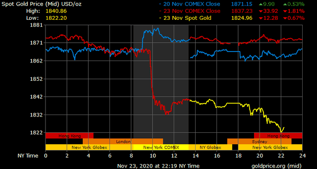Giá vàng thế giới phiên ngày thứ Hai đột ngột lao dốc, bị bán tháo mạnh sau khi “ngòi nổ” chính trị tại Mỹ được tháo gỡ với việc chính quyền của ông Trump chấp nhận chuyển giao quyền lực cho ông Biden.