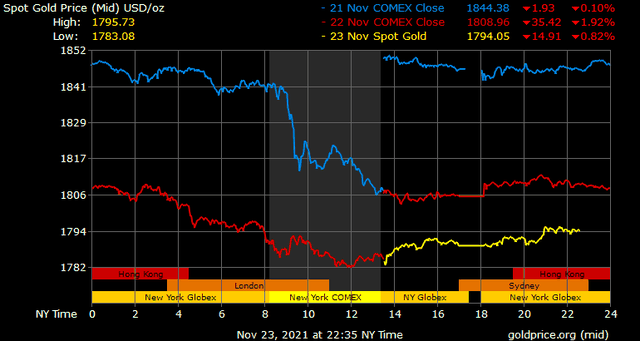 Giá vàng tương lai giao tháng 12 trên sàn Comex New York tăng hơn 10 USD lên 1.794,4 USD/ounce.