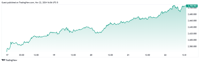 Giá vàng tương lai giao tháng 12/2024 trên sàn Comex New York tăng 37,3 USD, tương ứng tăng 1,39% lên mức 2.712,2 USD/ounce. Tính chung cả tuần, giá vàng giao ngay tăng 142,1 USD/ounce, tương ứng tăng 5,53%.