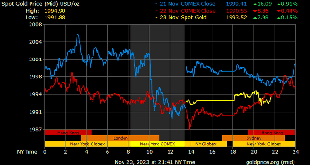 Vàng đã bước vào kỳ nghỉ lễ không giữ được mức tăng trên 2.000 USD/ounce khi thị trường tiếp tục xem xét biên bản cuộc họp chính sách tiền tệ tháng 11 của Cục Dự trữ Liên bang sẽ được công bố vào chiều thứ Ba.