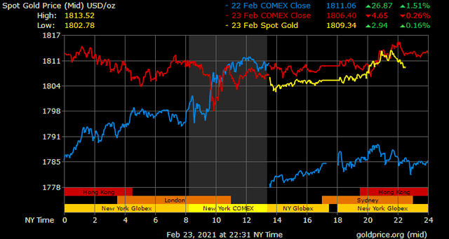 Giá vàng tương lai giao tháng 4 trên sàn Comex New York tăng 3,1 USD lên 1.809 USD/ounce.