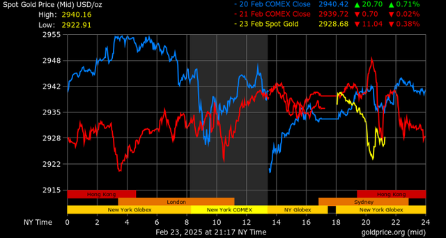Giá vàng tương lai giao tháng 4/2025 trên sàn Comex New York giảm nhẹ 2,9 USD, tương ứng giảm 0,1% xuống mức 2.953,2 USD/ounce.