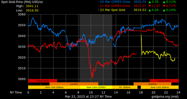 Giá vàng tương lai giao tháng 4/2025 trên sàn Comex New York giảm 22,4 USD, tương ứng giảm 0,74% xuống mức 3.021,4 USD/ounce.