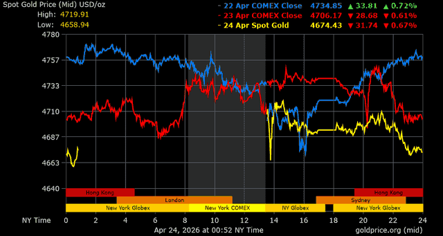Trên thị trường vàng thế giới, giá vàng giao ngay chốt phiên hôm qua tại Mỹ giảm 46,4 USD, tương ứng giảm 0,98% xuống mức 4.694,1 USD/ounce. Sang phiên châu Á sáng nay, giá vàng tiếp tục giảm 18,8 USD xuống mức 4.675,3 USD/ounce.