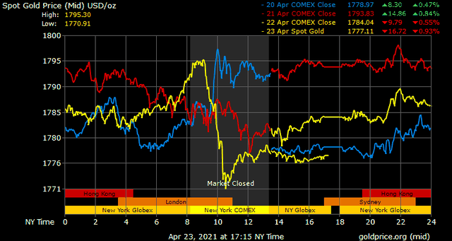Trên thị trường vàng thế giới, giá vàng giao ngay chốt phiên đêm qua tại Mỹ giảm 7 USD xuống 1.776,9 USD/ounce. Giá vàng tương lai giao tháng 5 trên sàn Comex New York giảm 5,7 USD xuống 1.775,8 USD/ounce.