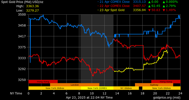 Trên thị trường vàng thế giới, giá vàng giao ngay chốt phiên hôm qua tại Mỹ giảm mạnh 92,9 USD xuống mức 3.288,2 USD/ounce. Sang phiên châu Á sáng nay, giá vàng đảo chiều tăng 74,5 USD lên 3.362,8 USD/ounce.