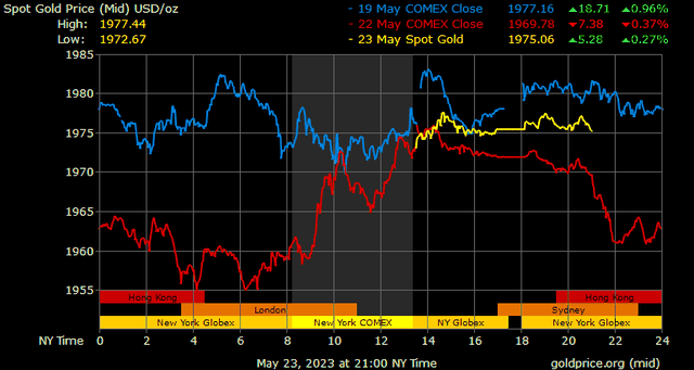 Giá vàng tương lai giao tháng 6/2023 trên sàn Comex New York giảm 2,7 USD, tương ứng giảm 0,14% lên 1.974,5 USD/ounce.