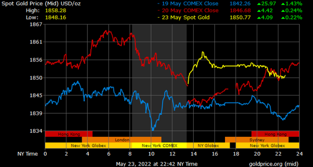 Giá vàng tương lai giao tháng 6/2022 trên sàn Comex New York tăng 5,7 USD lên mức 1.847,8 USD/ounce.