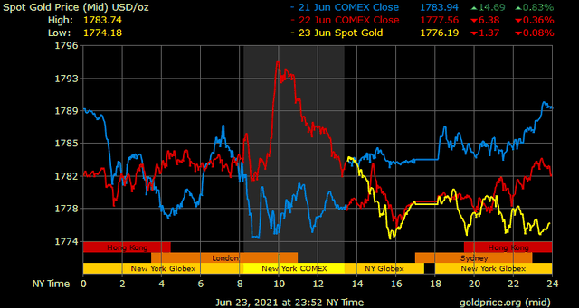 Trên thị trường vàng thế giới, giá vàng giao ngay chốt phiên đêm qua tại Mỹ giảm 0,5 USD xuống 1.778,3 USD/ounce. Sang phiên châu Á sáng nay, giá vàng giảm nhẹ xuống gần 1.775 USD/ounce.
