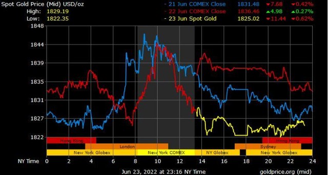 Giá vàng tương lai giao tháng 8/2022 trên sàn Comex New York giảm 8,6 USD xuống 1.829,8 USD/ounce.