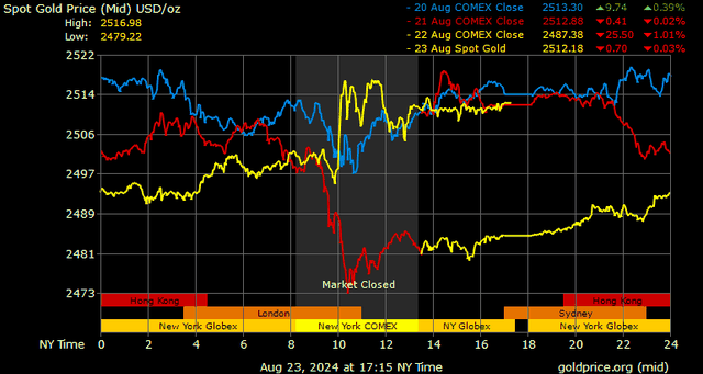 Trên thị trường vàng thế giới, giá vàng giao ngay chốt phiên hôm qua tại Mỹ tăng 27,8 USD lên 2.512,5 USD/ounce.