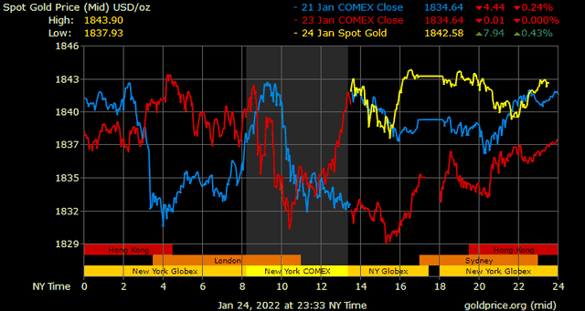 Giá vàng tương lai giao tháng 2/2022 trên sàn Comex New York tăng hơn 1 USD lên 1.842,8 USD/ounce.