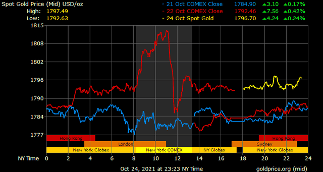 Giá vàng thế giới phiên ngày thứ Sáu tăng khá mạnh, thậm chí đã có lúc đạt gần 1.815/ounce, nhưng cũng đã hạ nhiệt khá nhanh sau đó, bởi nhận định của chủ tịch Fed rằng, lạm phát tại Mỹ có thể sẽ kéo dài sang năm sau.