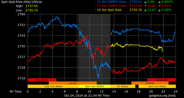 Trên thị trường vàng thế giới, giá vàng giao ngay chốt phiên hôm qua tại Mỹ tăng 20,5 USD lên 2.736,1 USD/ounce. Sang phiên châu Á sáng nay, giá vàng đảo chiều giảm 5,6 USD xuống 2.730,5 USD/ounce.